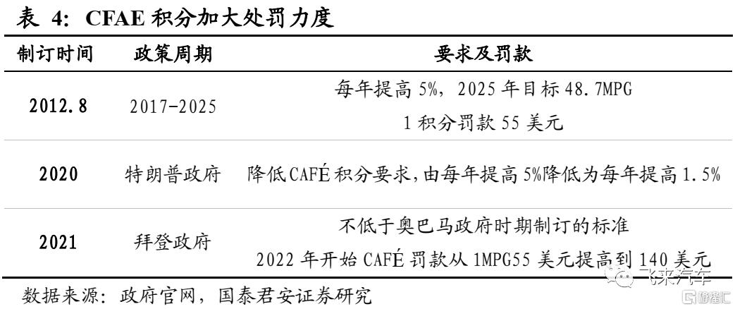 拜登政府将提高CAFÉ积分要求加大处罚力度。CAFÉ是指公司平均燃料经济性(corporate average fuel economy),是汽车公司各车型年度销售量加权平均的燃料经济性,通常用每加仑燃料行驶的里程数(MPG)表示,MPG越高代表每单位燃油下的续航里程要求越高。CAFÉ标准适用于在美国销售的、总重(GVWR)不超过8500磅的乘用车和轻卡。2012年制定的2017-2025年CAFÉ标准为每年提高5%,在2020年,特朗普政府降低CAFÉ积分要求,由每年提高5%降低为每年提高1.5%。拜登政府将提高燃油经济性标准,承诺将比奥巴马时期标准更加严格,同时加大罚款力度,2021年1月NHTSA已宣布从2022年开始CAFÉ罚款从1MPG55美元提高到1MPG140美元。
