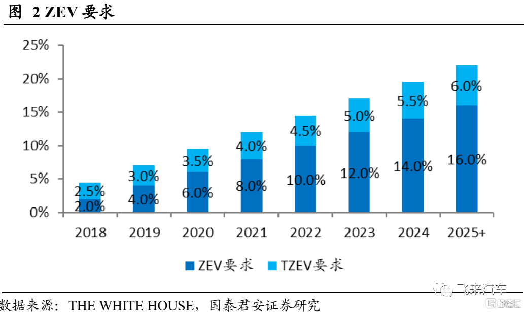 加州ZEV法规提高要求,实施州范围扩大。加州ZEV是指:要求销量达到一定规模的汽车制造企业销售ZEV(零排放汽车)要达到一定比例,每年按销售规模与积分比例计算出该企业应达到的积分,未达标处以每个积分5000美元罚款,有多余积分企业可以出售积分。ZEV积分要求从2018的2%提高到2025年为16%,TZEV从2.5%提高到6%。截至2020年底,已有包括加州、华盛顿州、纽约州在内的14个州开始实施ZEV法规。