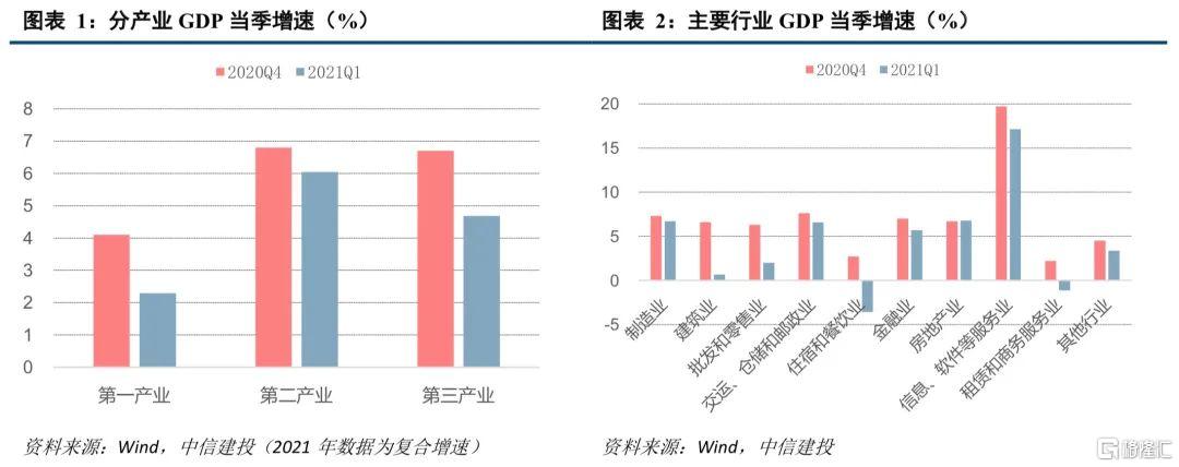 一季度导致经济增长偏低的不利因素将逐步解除,二季度GDP的复合增速大概率要高于一季度。2021Q1 GDP同比增长18.3%,略低于预期,两年平均增长5.0%,比2020年Q4增速有所放缓。从各行业的生产来看,2021Q1制造业复合增长6.7%,仍保持较高增速,回落明显的主要是建筑业和服务业,建筑业复合增速降至0.7%,批发零售复合增速降至2.0%,住宿餐饮复合增速回落至-3.6%,租赁和商务服务业复合增速回落至-1.1%。因此一季度经济增速低于预期主要是疫情反弹和就地过年对建筑业、服务业造成客观影响,在疫情缓解和春节之后,上述不利因素逐步解除,以上行业进一步恢复的空间就大。