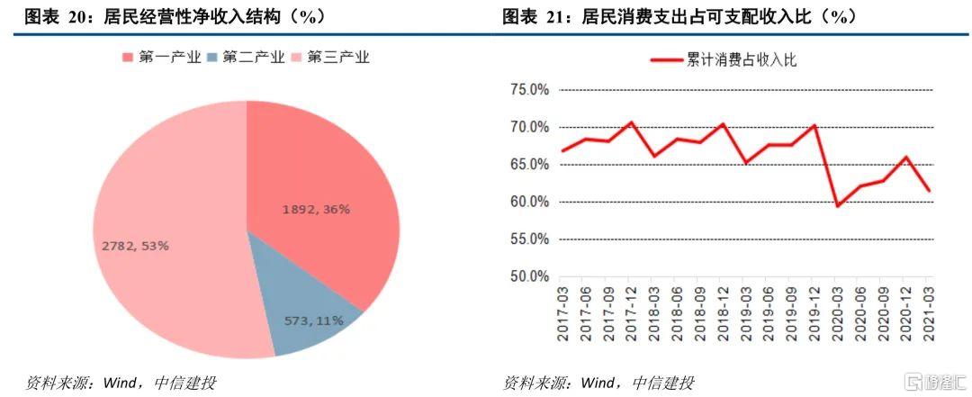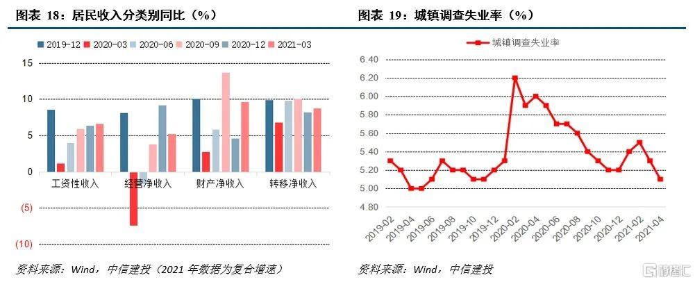 限制消费的因素正逐步改善,因此未来消费仍将向好。影响消费的核心因素是收入,再次是消费意愿。当前消费仍未完全修复的原因一是收入仍未恢复,二是消费意愿的下降。居民可支配收入由四部分构成,其中工资性收入占比56%,是最主要的部分。目前来看,由于疫情对就业的冲击,工资性收入增速仍未恢复到正常水平,但呈逐季恢复的趋势,随政府加大对就业的政策支持力度,就业形势持续向好,4月城镇调查失业率回落至5.1%,恢复至2019年水平,预计居民工资性收入增速将进一步提升。