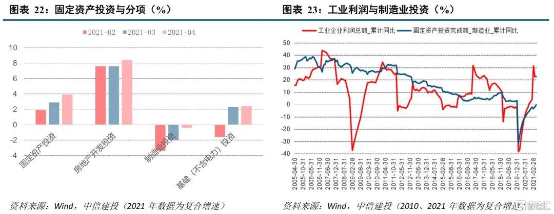 消费和制造业投资偏低成为政策关注要点。4月30日政治局会议指出当前经济恢复不均衡、基础不稳固,提出要促进国内需求加快恢复,促进制造业投资和民间投资尽快恢复,包括制定促进共同富裕行动纲要,以城乡居民收入普遍增长支撑内需持续扩大,优化民营经济发展环境,以及结构性政策支持等。总体上,政策层面将持续支持消费和制造业投资的复苏。