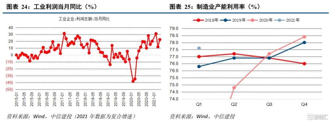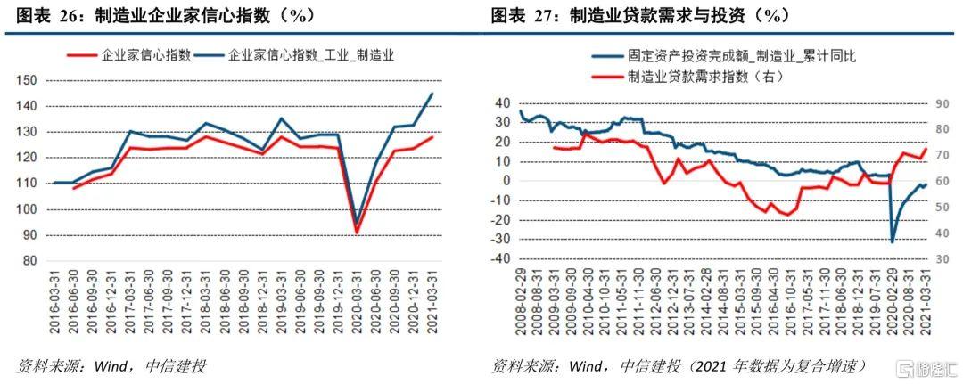 利润、产能、企业家信心、融资均支持制造业投资的回升。制造业投资的关键影响因素包括企业利润、产能利用状况、企业家信心、融资可得性,目前看几大因素均支持制造业投资的回升。自去年疫情首次冲击之后,企业利润从谷底爬坡总体改善,2021年前四个月工业企业利润累计同比增长106.1%,复合增速为22.3%,是近年的较高水平。2020年三季度至2021年一季度,制造业产能利用率提升明显,均远超近年同期水平。企业家信心指数持续提升,尤其制造业企业信心指数创出新高。根据央行表述,3月末,制造业中长期贷款增速为40.9%,增速连续上升17个月,制造业融资持续向好,支持政策也持续加强。制造业贷款需求也在总体攀升,预示投资需求的提升。综上,我们认为制造业投资的主旋律仍是持续向好,预期全年同比增长中枢为8.5%,复合增速中枢为3%。