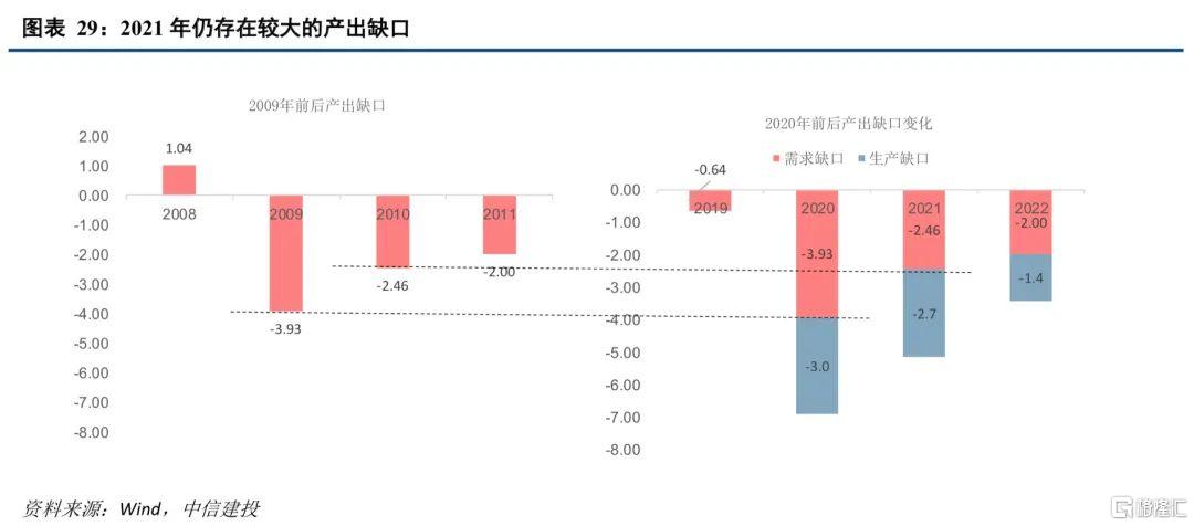 产需缺口对本轮工业品涨价的影响尤为重要。生产方面,2020年底工业生产已修复至2019年底水平。生产快速复苏一方面得益于我国有效的防疫措施,另一方面归于其他新兴的制造业国家生产受限,出口份额转移。那么国际生产和需求的缺口对本轮工业品涨价的持续性就至关重要。根据OECD 2020年12月的预测,2021年OECD国家仍存在较大缺口。考虑到新冠疫情不仅冲击需求,也冲击生产,这里我们以2009年至2011年作为参考,将2020年至2022年的产出缺口简单地拆分为需求缺口和生产缺口。在当前疫苗接种按步骤进行的前提下,2021年生产缺口并没有显著收窄,海外供给不足仍将影响2021全年的工业价格。