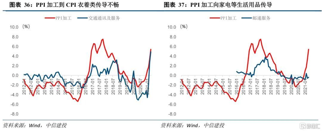 虽然整体传导不畅,但上游工业品价格可以向部分下游生活用品价格传导。上游工业品价格向衣着类价格传导不畅,部分原因在于衣着类对农业的依赖程度较高。我们看到衣着类CPI持续走低,与PPI加工的走势相关性较低。上游工业品价格可以向家用电器类商品价格传导。我们观察到PPI加工、PPI一般日用品、CPI生活用品、CPI家用电气的波动具有同步性;PPI上游价格可以传导到日用品、家电等消费领域。