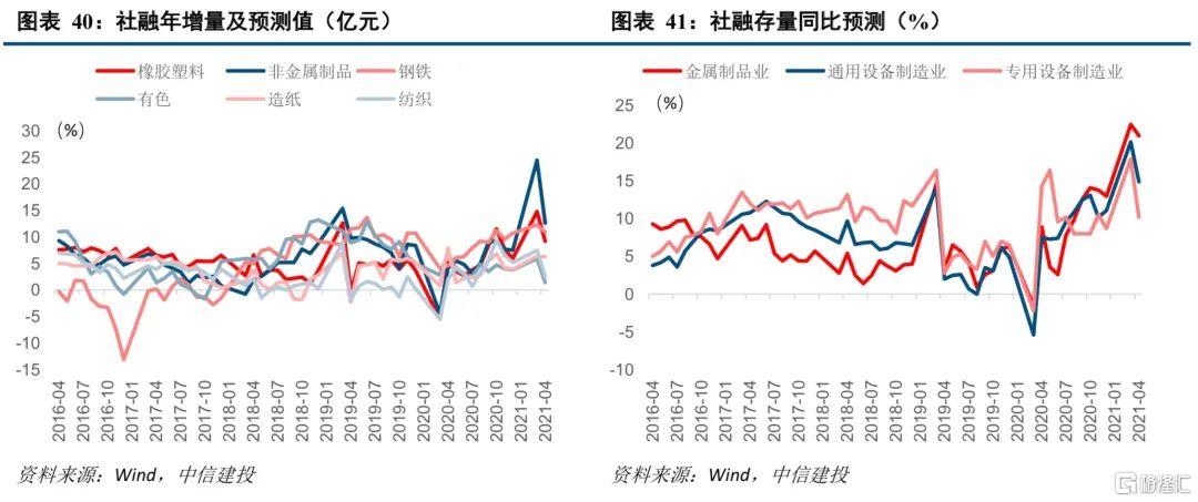 第三,从投资方面来看,科技、医药、原材料投资仍保持较高的增速。2021年4月医药和科技行业的固定资产投资累计复合增速分别为15%和13.8%,仍是高位运行。原材料行业固定资产投资相对较好,煤炭、化工、钢铁、有色四个行业固定资产投资复合增速分别为5.1%、2.5%、25.1%和5.4%,受碳中和影响,原材料行业未来一段时间技改投资仍有一定需求。通用设备、专用设备行业固定资产投资增速走弱,4月累计复合增速分别为-8.5%和2.3%。通用设备相对较好。