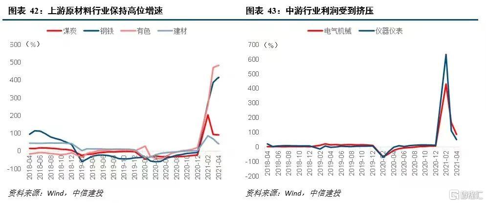 其次,盈利方面,大宗商品价格高位推升原材料行业利润;中游行业利润受到挤压。2021年4月煤炭、钢铁、有色、化工累计复合增速分别为18.2%、43%、86.7%和39.1%,增速较高。中游设备行业通用设备、专用设备、电气设备和仪器仪表行业的利润累计利润复合增速分别为17.6%、31.2%、19.7%和21.4%;利润增速显著弱于上游原材料行业。