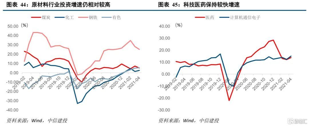 上半年制造业结构上出现分化。首先生产方面,中游设备、科技医药行业仍保持较高增速,原材料行业生产有所放缓。从两年复合增速来看,煤炭、钢铁、有色、化工的工业增加值呈现逐步放缓的趋势,2021年4月,四个行业工业增加值分别为3.2%、7.7%、4.1%和5.9%。中游行业的工业增加值仍保持相对高增速,通用设备、专用设备、电气设备、仪器仪表设备的工业增加值分别为11.1%、12.2%、6.7%和10.1%。科技(计算机通信电子)和医药行业工业增加分别11.1%和11.7%。
