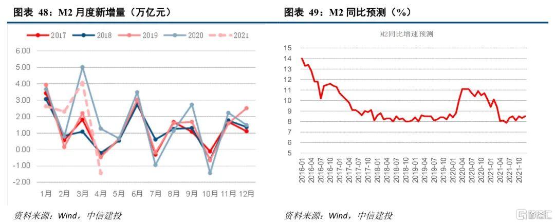 M2增速基本探底,后期震荡中或小幅回升。4月M2余额同比增长8.1%(前值9.4%),回落1.3个百分点,是全年回落最为明显的月份。除了高基数影响,社融增量放缓也拖累货币供应量,M2月度新增量低于过去几年同期平均水平。由于M2存量增速在去年5月先于社融增速触顶,因此下半年M2增速的高基数效应不明显,我们测算M2增速逐步从2020年末的10.1%回落至8.5%左右,当前M2增速为8.1%,因此下半年M2增速或震荡中小幅回升。