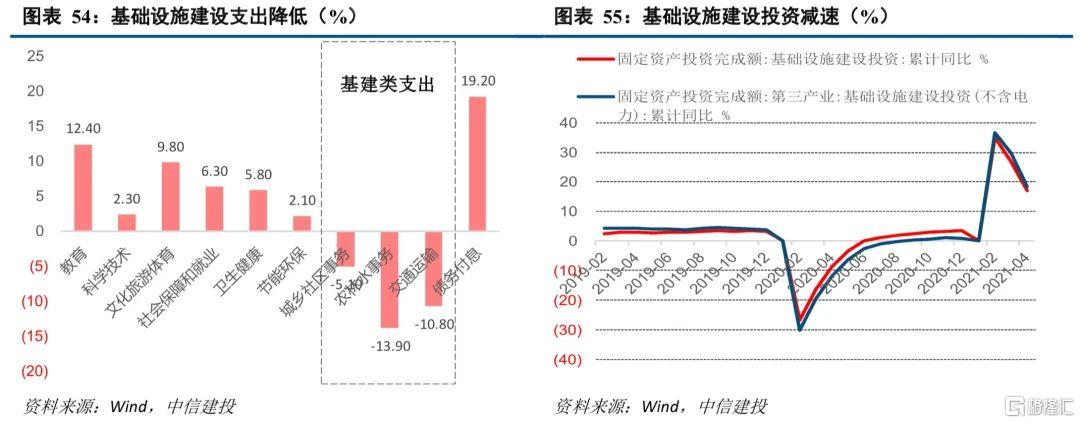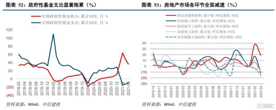 上半年财政收入完成比例超过往年同期,因此支出节奏偏慢并不体现财政压力而是政府主动压降非必要支出的结果。在经济动能持续恢复、企业利润空间扩大、土地出让收入保持增长的情况下,1-4月财政收入增速高达25.50%,剔除基数效应后的两年复合增速3.62%。截止4月,公共财政收入完成预算额度的39.47%,显著快于2020年的34.5%以及2019年的37.7%。分项看,1-4月与企业经营相关税收中增值税(+24.70%)、企业所得税(+25.70%)和个人所得税(+22.80%)增速较快,房地产相关税种中契税(+51.41%)、土地增值税(+40.60%)、城市维护建设税(+27.8%)显著拉动税收增速。政府性基金收入方面,1-4月收入增速高达36.60%,两年复合增速11.4%,完成收入进度的26.68%。因此,1-4月广义财政支出速度偏慢并非受制于收支平衡,而是在稳增长压力较小的窗口期,地方政府主动压降基建类支出的结果。