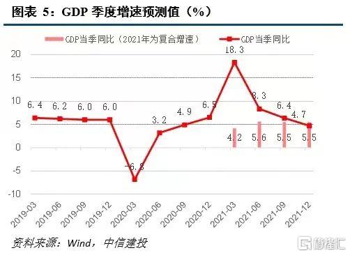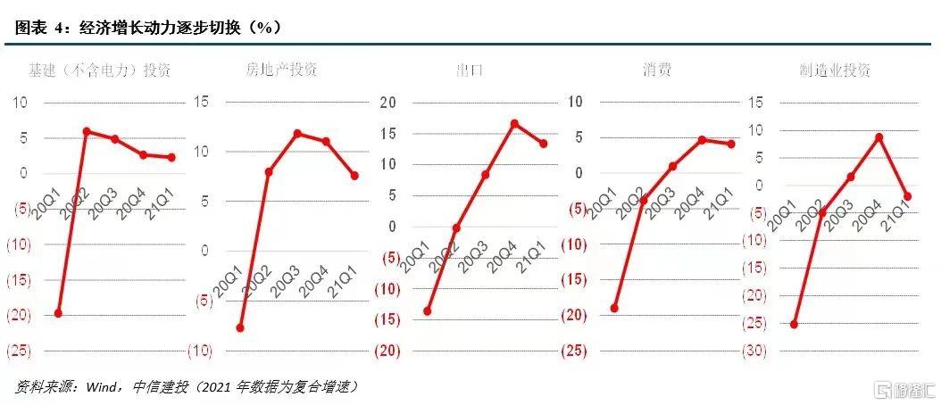 4月30日政治局会议提出,要用好稳增长压力较小的窗口期,推动经济稳中向好,凝神聚力深化供给侧结构性改革,打通国内大循环、国内国际双循环堵点,为“十四五”时期我国经济发展提供持续动力。因此,逆周期、稳增长的政策将不再是主要选项,叠加房地产调控力度逐步加大,政策相继出台,如规范房地产企业的“三条红线”政策,建立银行业金融机构房地产贷款集中度管理制度,严查经营贷、消费贷进入楼市,保障性租赁住房和共有产权住房供给,防止以学区房等名义炒作房价等,我们预计全年基建投资增长平稳、低速,地产投资逐步回落,而出口增速也将在下半年加快放缓(详述见下文),因此三、四季度经济增长动力预计弱于二季度,我们测算三、四季度GDP同比增速中枢约6.4%、4.7%,复合增速中枢约5.5%、5.5%,即以复合增速衡量的增速顶部在二季度。全年GDP增速中枢为8.8%。