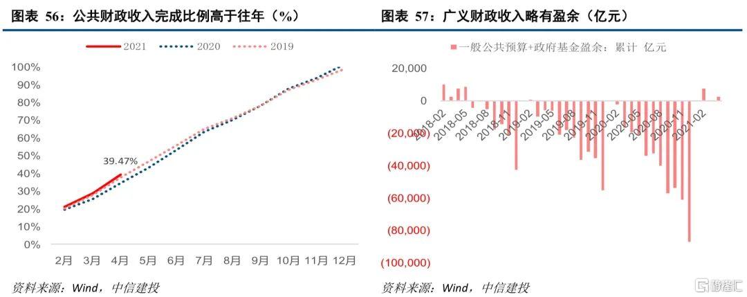 展望全年,支出节奏料将自6月开始小幅提速,全年大概率符合预算。而收入端存在超收可能,造成全年赤字不及预算,因此全年财政压力相对较小。上文已经分析,1-4月财政支出进度与往年并没有明显差异,前4个月完成财政支出的比例一般在30-35%左右,今年没有例外。与往年不同的是,今年的提前批债务限额在3月才下达至地方,叠加财政托底需求较小、财政跨周期平衡等因素,今年基建类支出的增速相对乏力。随着6月初地方债额度下达,我们预计6月后地方债发行和财政支出小幅提速。但更需要注意的是在全球经济共振复苏的大背景下,降杠杆、防风险、保持财政定力是贯穿全年的重要基调,因此财政支出增速料将较低预期。