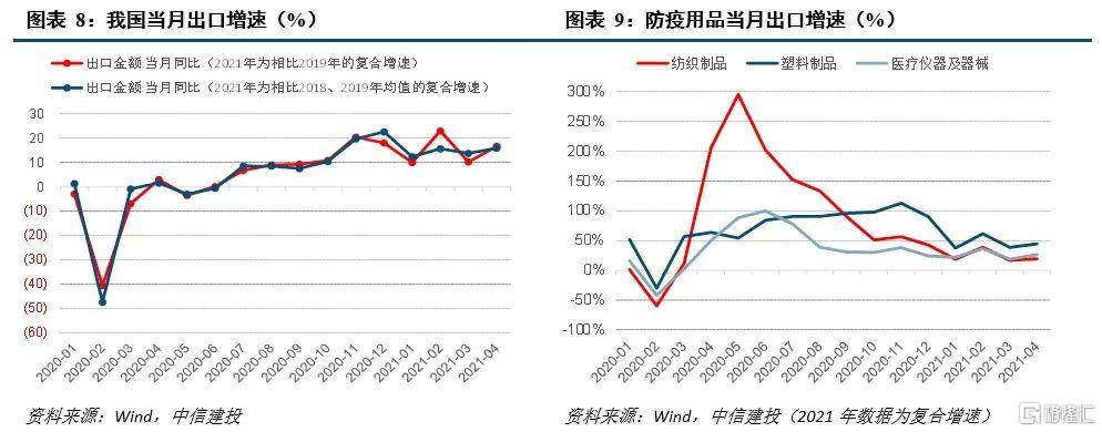 2021年以来出口增速已边际放缓,但仍具韧性,较高的增速有望维持一个季度以上。在观测2021年各月出口增速时,市场普遍采用相比2019年的复合增速,因此增速的高低也容易受到2019年基数的影响,我们建议采用相比2018和2019年两年的同期出口金额平均值,以降低个别月份基数的影响,最终我们可以观测到进入2021年以来,剔除基数效应后的出口增速相比2020年11、12月已有放缓,主要是与疫情相关的出口品类增速开始下降。