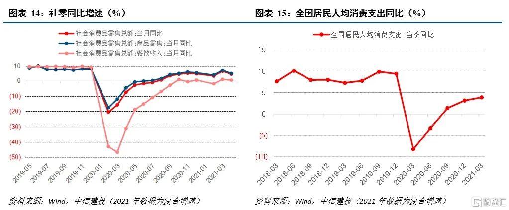 当前社零增速仍偏低,但3月的强劲反弹和4月的大幅回落不应过度解读,消费仍处于恢复趋势中。疫情之后,消费本处于稳步修复的趋势之中,2020年11月社零增速恢复到5%,随后冬季疫情局部反弹叠加就地过年的影响,消费修复的进程再次被阻断,2021年1-2月社零复合增速回落至3.1%。但3月份社零复合增速强劲反弹至6.3%,市场一度对消费过度乐观。而4月社零复合增速又再次回落至4.3%,市场对消费又过度悲观。实际上,对3月、4月数据的大幅波动不应过度解读,3月的强劲反弹是由于年初受疫情影响的部分消费需求在3月份释放,导致3月份社会消费品零售总额增速较高,而4月的再度回落也有3月部分消费提前释放的影响。因此更应将3-4月的消费合并来看,则其增长是好于1-2月的,说明消费仍是在修复的。此外,若从居民人均消费支出增速来看,自去年二季度以来,消费支出也是逐季回升的。