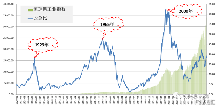 觀察1920年迄今的股金比(下圖),存在着一個近乎完美的百年美股黃金週期。在每個週期中,我們都能看見明顯可識別的峯值,峯值與峯值之間的間隔在35年左右。