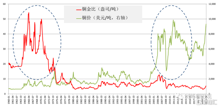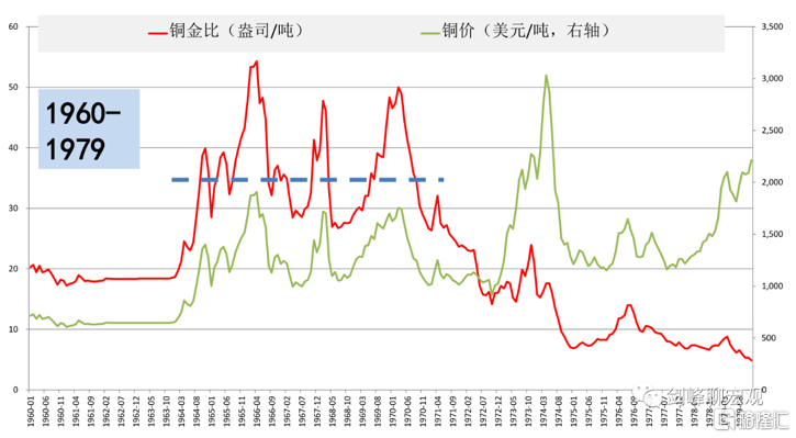 同樣將1960年以來的數據大體等分為三個時間段。第一個時間段是1960-1979年。在這20年,由於銅產量尚且有限,銅的黃金價格均值為22盎司/噸。其中,1965年至1971年日德快速工業化時期高達35盎司/噸,最高甚至衝破了50盎司/噸。1973年佈雷頓森林體系徹底瓦解時,雖然銅的美元價格飆漲超過了2000美元/噸,但銅的黃金價格已經下跌到10盎司/噸以下。