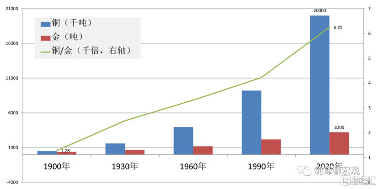 之所以在黃金眼中銅不“值錢”,就是因為銅的產量實在太大,產量增幅也不慢(上圖)。120年前的1900年,全球銅的產量不足500千噸,金的產量不足400噸,銅產量是金產量的1280倍;到2020年銅的產量翻了40倍,達到20000千噸,金的產量只漲了8倍,達到3200噸,銅產量是金產量的6250倍。從銅產量與全球人口的比較也可以看到銅的豐沛:1960年到2020年,全球人口翻了2.5倍,銅的產量翻了5倍多,也就是説,全球人均銅產量已經相當於60年前的2倍。