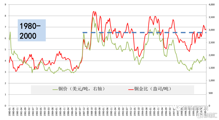 第二個時間段是1980-2000年。這20年銅的產量較前一個20年已經翻了2倍,所以,銅的黃金價格均值僅僅為5盎司/噸多一點。這20年的工業化主要發生在80年代後期的韓國、東亞四小龍等新興經濟體,從1987至2000年間,銅的黃金價格均值為6.5盎司/噸。需要注意的是,由於美國引領的全球化和信息技術革命,這20年中銅的黃金價格和銅的美元價格是完全共週期的。