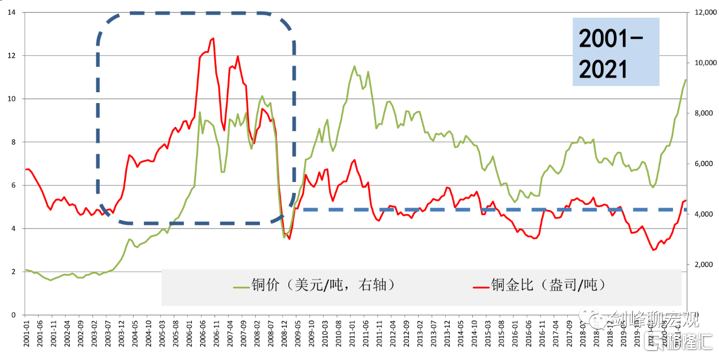 新世紀的二十年可以再分為兩個階段。第一個階段是2001-2010年,這一階段的基本特徵是中國加入WTO,從而全面融入全球化。儘管受到2008年全球危機的衝擊,但2009年的宏觀刺激政策再次將中國拉入到快速增長的通道。所以,銅從新世紀初的80%歷史均價持續漲到歷史均價的3倍之多。在這十年,信息技術革命後的美國遭遇兩次嚴重打擊:911恐怖襲擊和2008年金融危機。所以,股弱、金強。