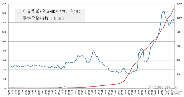 1971年,深受越戰煎熬、精疲力竭的美國最終支撐不住,拒絕了履行美元兑換黃金的義務,佈雷頓森林體系名存實亡。1973年,整個西歐脱離了美元體系,全球貨幣體制進入信用本位時代。從此,貨幣就徹底擺脱了黃金的約束。在1970年,英國的廣義貨幣/名義GDP只有不到40%,2003年超過了100%,2009年達到163%的頂峯。貨幣的飆漲直接反映在了物價水平上。在1870年到1970年的100年間,英國零售價格指數只漲了7倍,摺合年度通貨膨脹率不到2%;而在1970年到2020年的50年信用本位制時代,英國零售價格指數漲了16倍,摺合年度通貨膨脹率為5.7%。