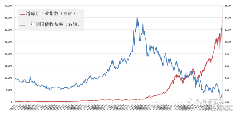 金本位對貨幣的約束和擺脱金本位後流動性的擴張,直接表現為一個長達80年的利率週期(上圖)。美國十年期國債收益率自1940年的2%持續上升到兩次石油危機的14%,上升了40年;隨後自1980年持續下降到2020年7月份最低的0.62%,下降了40年。利率長週期對應着資產價格長週期,以美股為例:在利率上升的40年,美股只漲了6倍;而在利率下降的40年,美股從875點漲到超過3萬點,漲幅34倍,年度複合增長率近9%。