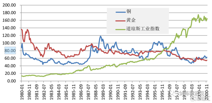 1981年,里根總統實施了放松管制的經濟和金融自由化改革,同時開始打壓後起大國日本。90年代之後,美國又引領第三次信息技術革命。在改革和技術革命的推動下,美股漲了20年。80年代中期後,以韓國、東南亞四小龍為代表的新興經濟體步入工業化,銅價得以回升,從1987年一直到1997年亞洲金融危機前夜都保持在歷史均價的80%左右。至於黃金,與美股相反,隨着美國實力的強勁回升,在波動中跌了20年。