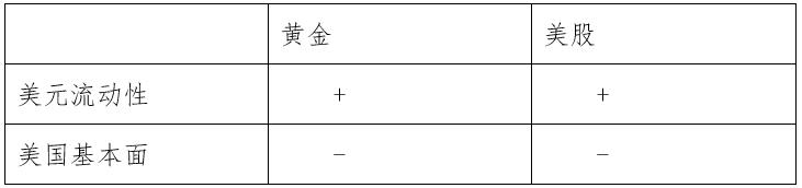 理解黃金的特性之後,再來看美股波動的因素,這可以分為兩大類:其一,美聯儲放水,美股上漲;其二,美國經濟基本面改善,美股上漲。將美股和黃金放到一個包含美元流動性和美國經濟基本面的二維表格中,我們就可以透過“黃金眼”看穿美股週期的因素。其中,“+”表示正相關,“-”表示負相關。例如,美元流動性增加,則金、股都漲;美國經濟基本面改善,則金跌、股漲。那麼,如何知道美股漲是因為基本面,還是因為流動性呢?