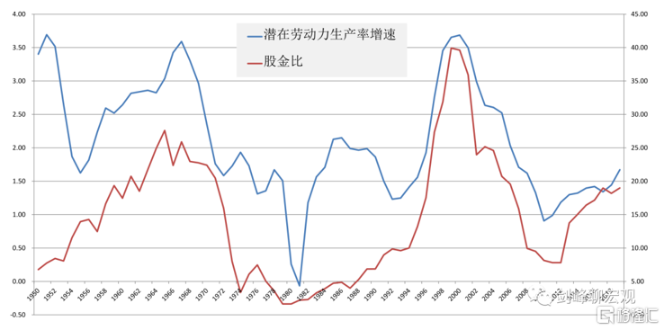 那麼,股金比是否真的就能反映美國經濟基本面?筆者曾經請中科院數學博士做了一個包含股票和黃金的資產定價模型,只要黃金具有上述屬性,這一模型的結果表明,股金比就是基本面。當然,我們可以用更為直觀的數據(上圖)。將1960-2019年的股金比與同期的美國潛在勞動力生產率增速放在一起,我們看到,兩者完全吻合,股金比的高點也是潛在勞動力生產率增速最高的時期。
