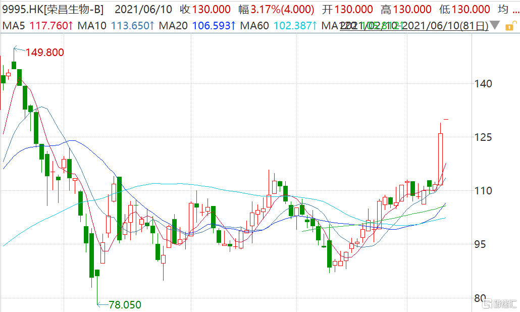 格隆汇6月10日丨昨日大涨12.8%后临停的荣昌生物-B(9995.HK)今早复牌高开3.17%报130港元,股价创今年2月底以来新高,市值637亿港元。公司昨晚公告,公司自主研发的新型靶向HER2抗体偶联物(ADC)注射用维迪西妥单抗(商品名︰爱地希)正式获中国药监局在中国的附条件上市批准,用于治疗局部晚期或转移性胃癌。该产品是集团继今年3月获得注射用泰它西普获准在国内上市后的第二款获批上市产品。