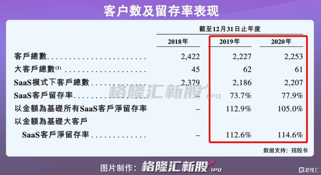 天潤雲表示,公司致力於培養與客户的長期關係,並定期使用客户留存率及以金額為基礎的淨留存率評估自身表現。但從2019年和2020年可以看出,SaaS客户留存率在客户總數中佔有絕對比例,分別為73.7%、77.9%。相同年度,以金額為基礎的所有SaaS客户淨留存率分別為112.9%和105%,而大客户SaaS客户的淨留存率分別為112.6%和114.6%。
