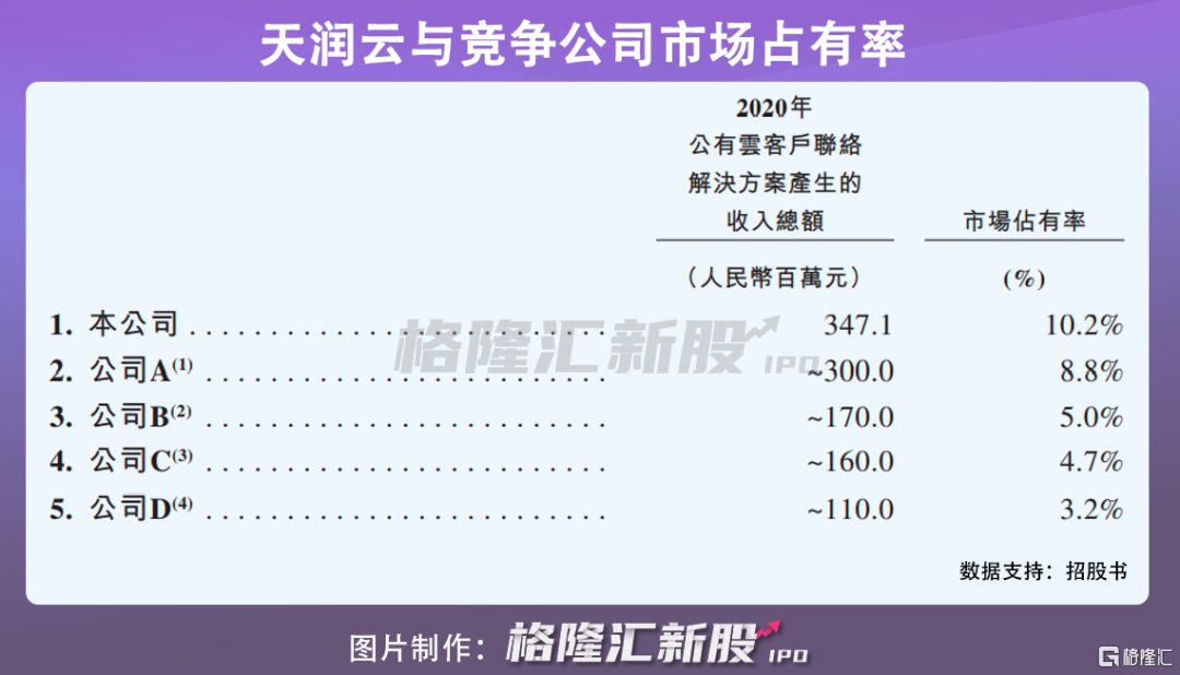 天潤雲成立於2006年,提供以雲模式作全面部署的一整套綜合客户聯絡解決方案。根據招股書,以2020年的收入計算,是中國最大的公有云客户聯絡解決方案供應商市場佔有率10.2%
