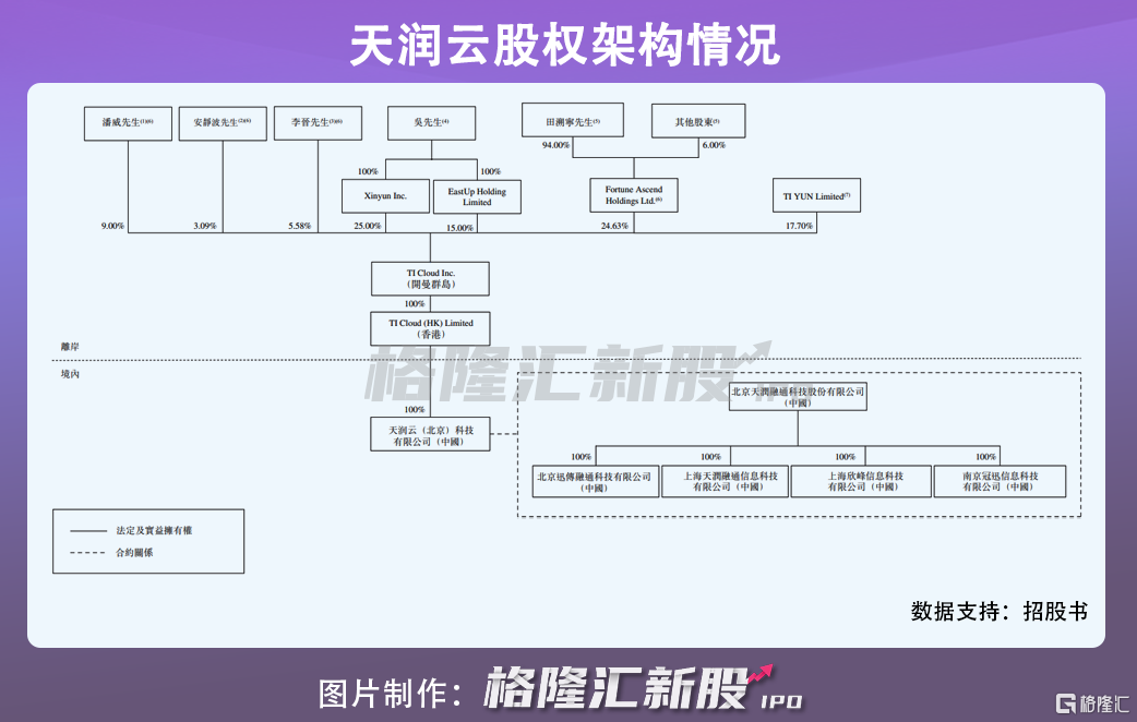 從股權結構來看,吳強、Fortune Ascend、潘威、安靜波、李晉是公司實際控制人,上市前吳強分別通過Xinyun、EastUp Holding持有天潤雲25.0%、15.0%的股權,合計持股40.0%。Fortune Ascend持股24.63%。另潘威、安靜波、李晉則分別持股9.00%、3.09%、5.58%。