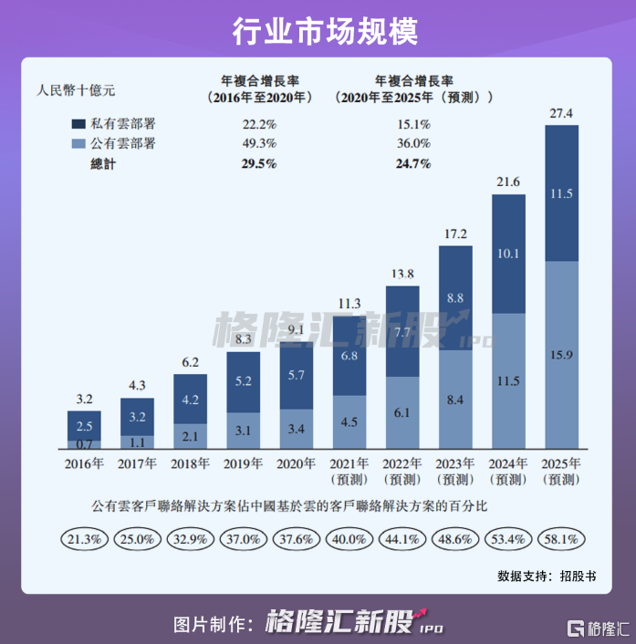 根據公開數據,行業市場規模(按收入計算)由2016年的32億元增長至2020年91億元,並預計2025年達到274億元。其中,公有云客户聯絡解決方案產生的收入迎爆發式增長,由2016年的7億元人民幣增加至2020年的34億元。