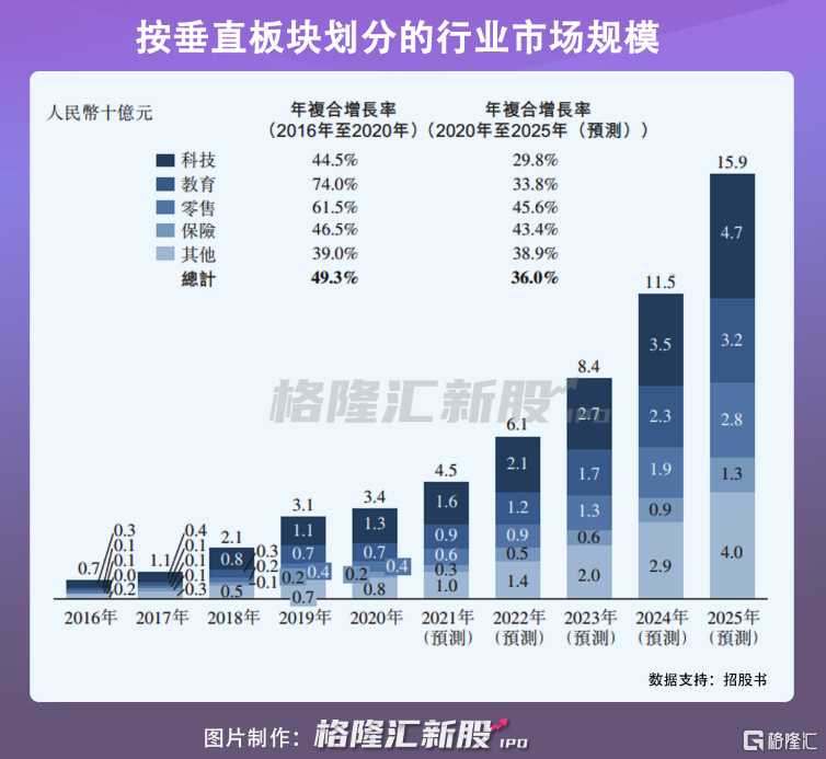 比如,科技板塊產生的收入由2016年3億元人民幣增長至2020年的13億元,年複合增長率為44.5%。同時,預期2025年將達到47億元人民幣。