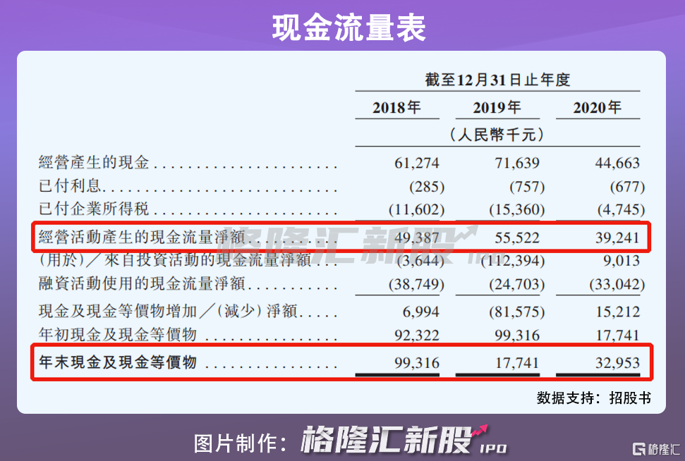 其次,天潤雲現金流並不充裕2018年至2020年,其經營活動產生的現金流量淨額分別為0.49億元、0.55億元、0.39億元;年末現金及現金等價物分別為0.99億元、0.17億元,0.33億元。