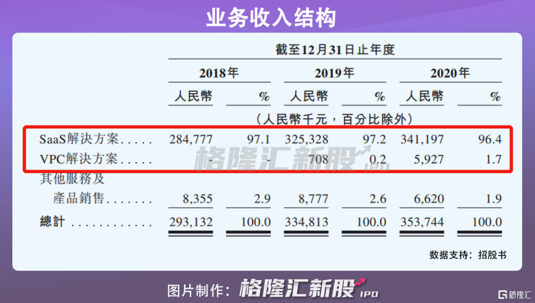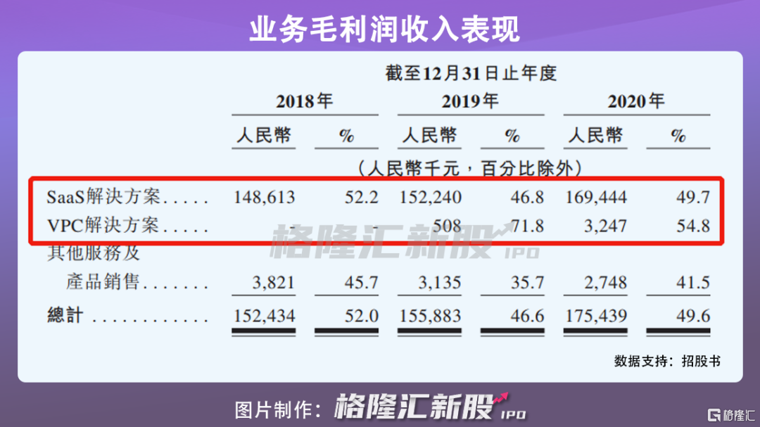 毛利潤方面,SaaS解決方案的淨利遠高於VPC解決方案。報吿期內,前者毛利潤分別為1.48億、1.52億、1.69億元人民幣;後者則分別為0、50.8萬、324.7萬元人民幣。同時,VPC解決方案毛利潤佔比出現下滑,由2019年71.8%減少至2020年的54.8%。