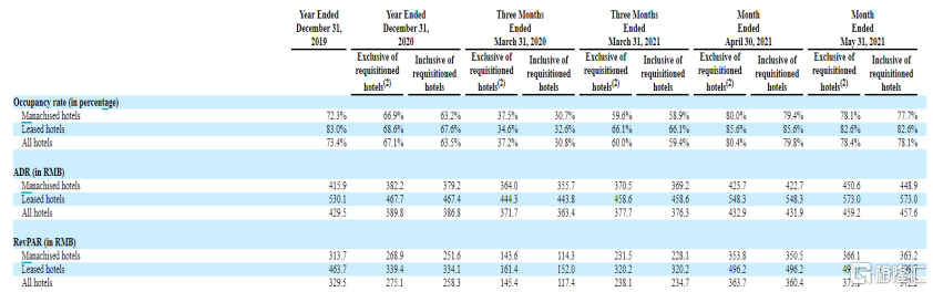 房价而言,表现亦可圈可点。2020亚朵集团产品趋势发布会上,亚朵集团酒店BU总裁非鱼曾透露,截止2020年9月,亚朵整体房价已恢复到去年同期水平的94%。招股书显示,亚朵2019年的ADR为429.5元,2020年不含隔离征用酒店的ADR为389.8元,今年4月、5月,这一指标已强势攀升至432.9元、459.2元。
