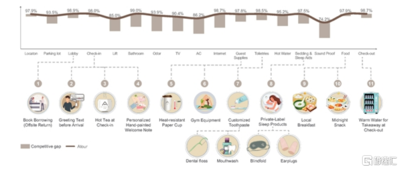其二:年轻、有洞察力的消费者越来越多,体验感追求提高,能够基于场景如购物、娱乐提供产品和服务的领先酒店品牌展现竞争优势。亚朵的用户画像较为年轻,2020年亚朵24.3%的顾客为30岁以下,45.8%的顾客为30岁至40岁之间,这部分消费者占比较高。且亚朵很早涉足这一领域,发展基于情景的零售业务及与生活方式品牌联名,这种趋势能够带来的效能已在亚朵的招股书中有所体现,并有望不断放大。例如,通过公区社区化,形成不同的属地化内容以连接更广泛、更远距离的用户。亚朵的品牌满意度始终居高,2020年至今,在酒店用户旅程的17个触点中获得最高的客户好评。