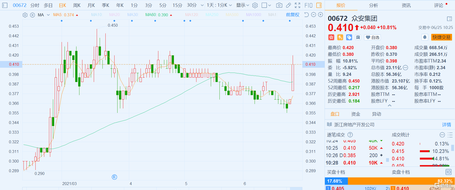 格隆汇6月25日丨众安集团(0672.HK)小幅高开,现涨幅扩大至近11%,报0.41港元,总市值23亿港元。