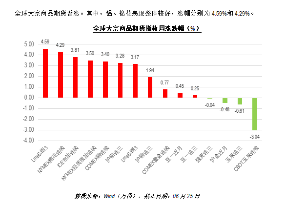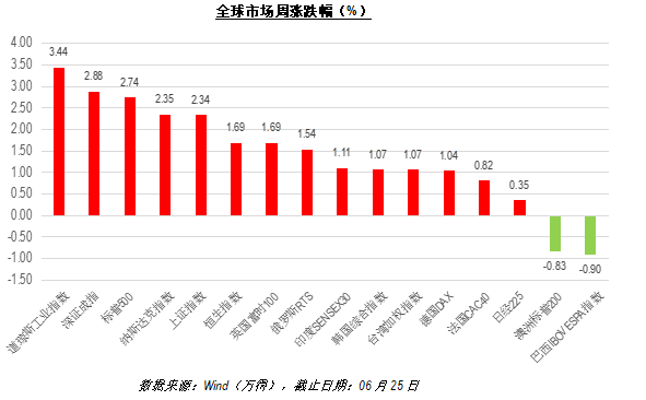 上周,全球市场普涨,美国地区领涨,道琼斯工业指数涨幅为3.44%。