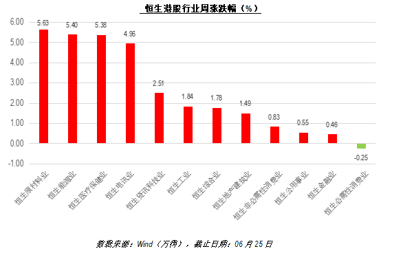 上周,港股板块全线上升,其中原材料、能源、医疗保健板块表现亮眼,涨幅均超5%。