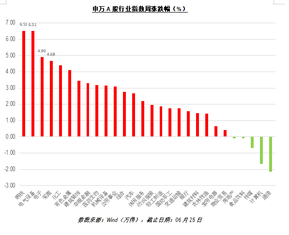 上周,申万一级行业涨幅喜人。其中,钢铁、电器设备领涨,涨幅都高达6.51%。