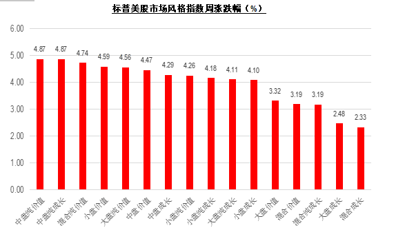 上周,标普美股市场风格指数集体上涨。其中,价值风格领涨,超过半数风格指数涨幅高于4%。