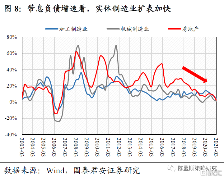 从扩表进程来看,地产放慢,实体制造业加快。用带息负债同比增速代表企业资产负债表的扩表进度,在信用扩张时期企业有息负债同比往往呈现高增长。2010年末、2016年初房地产有息负债增速超过50%,但2019-2020年有息负债同比增速仅不到10%;而实体制造业则在疫情后扩表进程呈现低位回升的特征,尤其加工制造业扩表增速已显著跑赢地产。这反映了,随着房地产对信贷资源虹吸效应的减弱,信贷结构逐步优化,由此带来的融资成本下行已成为新的边际亮点。