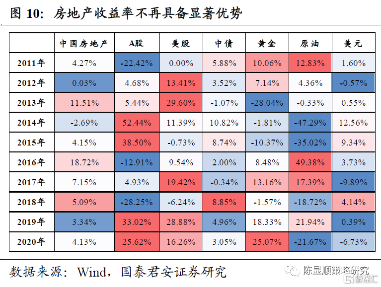 草蛇灰线:长期视角下,无风险利率逐级下行。一方面,资管新规打破刚兑,理财净值化转型加快,随着银行理财产品预期收益率下行且破净,寻找新资产的动力正在酝酿。另一方面,“房住不炒”提出以来,房地产行业在政策层面上受到明显压制,居民端的地产投资收益率同步下行。从各大类资产的投资收益率来看,国内房地产的收益率已过黄金时代,而权益等其他类型的资产则各领风骚。伴随房地产税试点预期提升,从大类资产配置角度看,股票市场有望迎来更多增量资金。