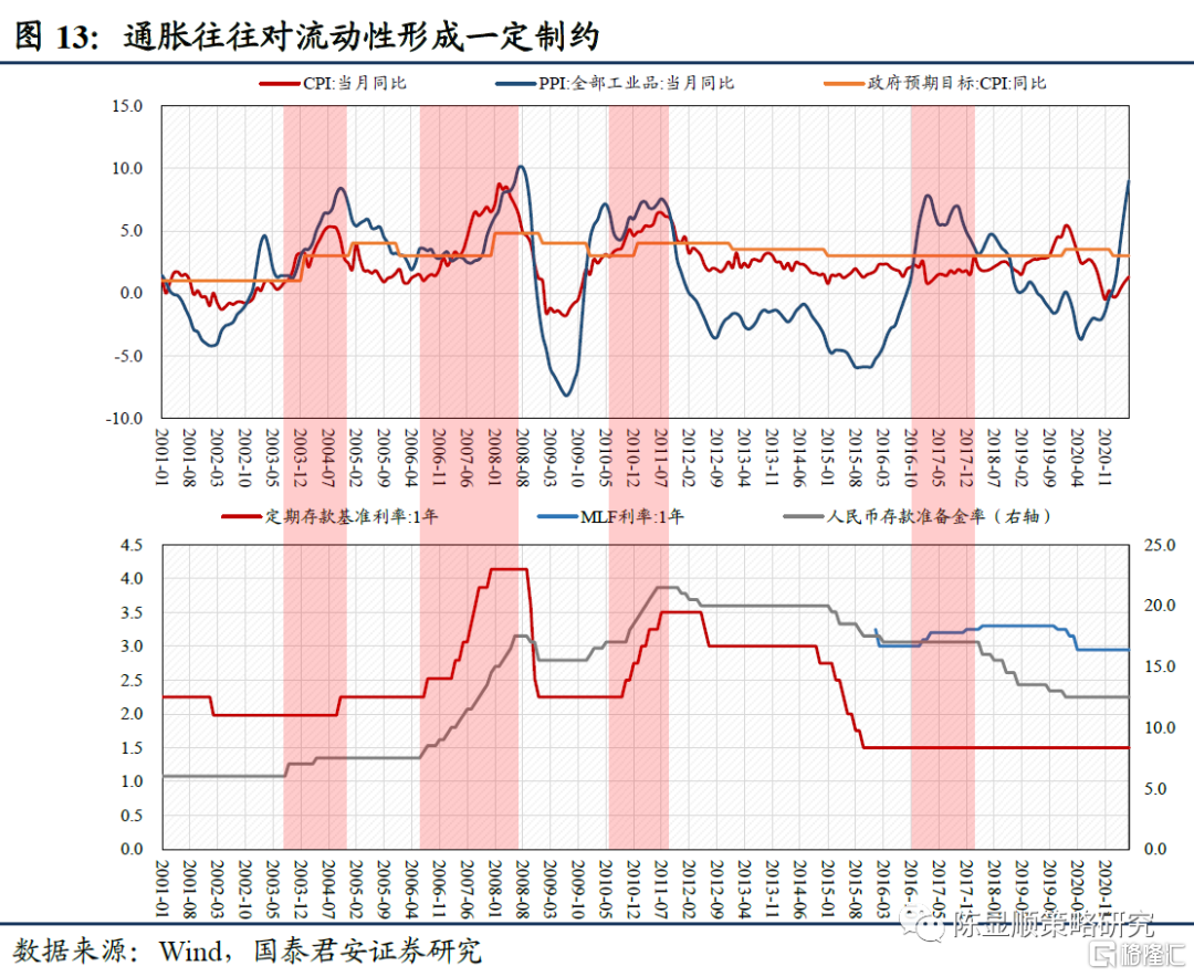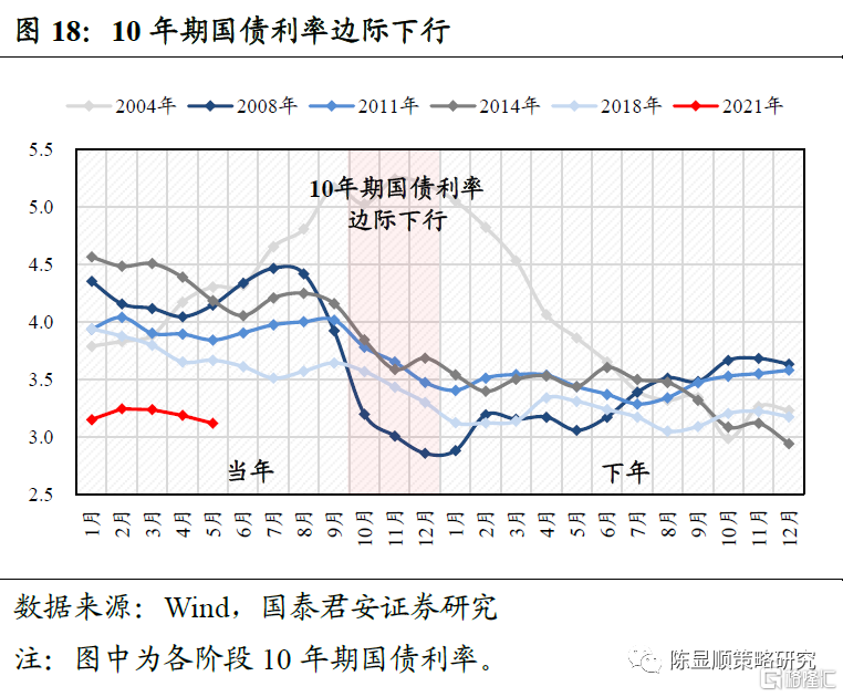 珠联璧合:战略判断下半年无风险利率的下行可能。1)国内5月PPI在低基数影响下同比高增9.0%如期见顶,四季度可能出现的次高点难超5月;5月CPI同比上涨1.3%并未及预期,央行对CPI全年2%以下的判断亦显示通胀无忧。通胀高点过后,信用收紧的幅度有望缓和,利率下行的核心制约显著缓解。2)21Q4盈利负增长压力凸显。历次盈利负增长拐点出现时,实际GDP同比增速在当季与前一季均呈明显下滑态势,经济增长压力较大。但压力之下,流动性越是易松难紧。3)中低收入群体资产负债表尚待修复,社零中乡村受损尤为严重,叠加收入差距拉大,社会消费倾向有所下降,货币政策“稳”的必要性更强。4)其他边际:存款利率定价方式改革、现金类理财管理办法的推出,带动市场无风险利率下行,边际上将驱动部分资金进入权益市场。