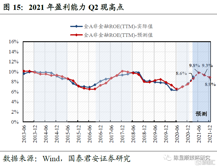 2)盈利能力节奏:单季ROE高点在Q2。2021年Q2-Q4各季度全A/全A非金融板块ROE分别为3.0%/2.4%/1.6%、3.1%/2.3%/1.3%,全年分别为9.6%和9.1%。