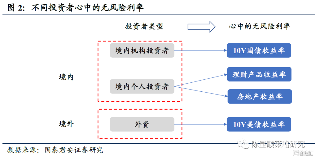 无风险利率具有时空维度下的差异性。对于市场整体而言,从时间维度来看,无风险利率的“锚”一直在变化。2013-2014年无风险利率的锚定物为信托产品收益率,而在2014年打破刚兑之后锚定物逐步转换成为城投债收益率,随着2018年之后逐步转化为银行理财产品收益率。值得注意的是,2020年疫情后银行理财产品预期收益率的下滑以及跌破净值是无风险利率下行的客观表征。对于不同的投资者,其无风险利率不一样,当前来看,1)内资机构:10年期国债收益率;2)国内个人投资者:银行理财产品收益率以及房价增速等;3)境外投资者:10年期美债收益率。考虑到居民资金通过基金入市的现象以及机构化趋势,理财产品收益率日益成为“广义无风险利率”。