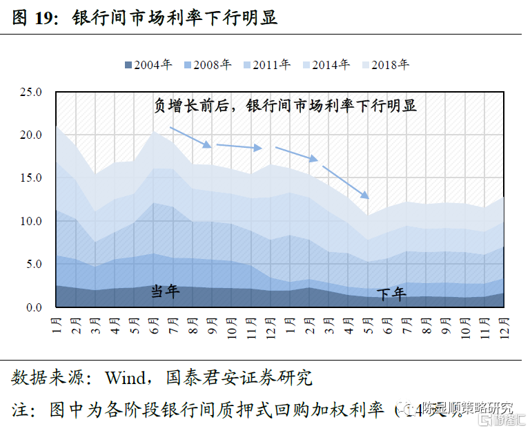1)量方面:在负增长拐点的前一季度,M2同比增速已基本温和触底,往后看均处于温和上行的过程中。此外在过去负增长时期,存款准备金率与存款基准利率均易降难升。2)价方面:从10年期国债利率来看,负增长时期边际下行幅度较大,从银行间市场利率来看,负增长拐点前后易处于下行趋势中。