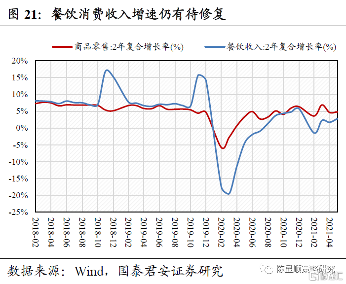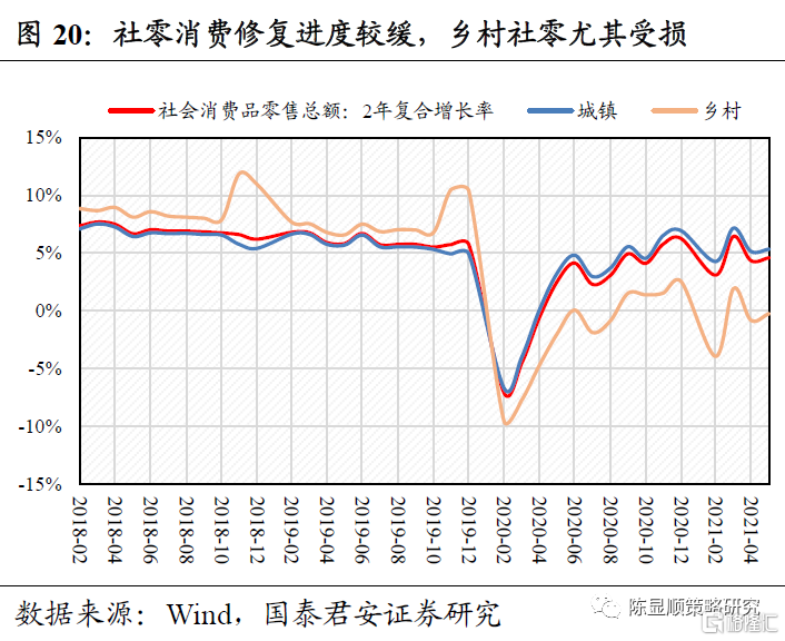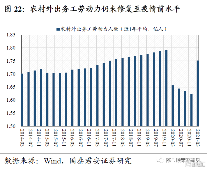 1)就业市场尚未完全修复。尽管5月城镇调查失业率为5.0%,与疫情前相近,但中低收入群体的就业情况与疫情前差距仍大,其中2021Q1农村外出务工人数不及2019年同期水平。