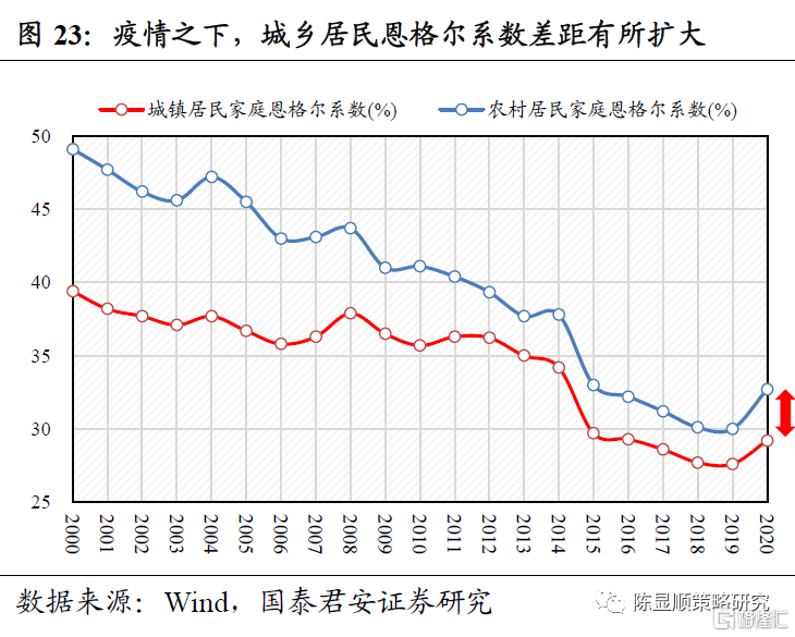 2)经济景气不足,叠加收入差距增大,社会消费倾向有所下降。具体来看:疫情之下,2020年城乡恩格尔系数均有所上行,且差距小幅扩大,其中农村居民家庭恩格尔系数由30.0%上升至32.7%,城镇居民家庭恩格尔系数由27.6%上升至29.2%。